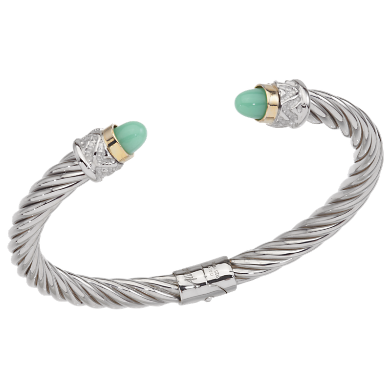 18K & 925 SS 5.75 MM twisted cable spring cuff bangle bracelet with scroll work & Chrysoprase cabochons, Rhodium Finish