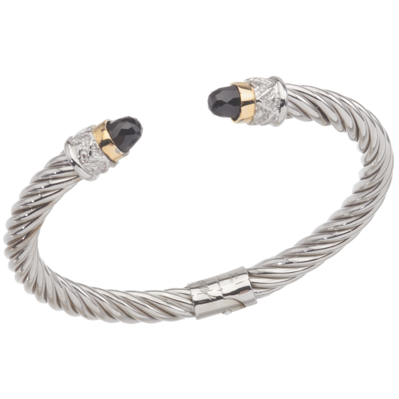 18K & 925 SS 5.75 MM twisted cable spring cuff bangle bracelet with scroll work & Faceted Black Spinel cabochons, Rhodium Finish