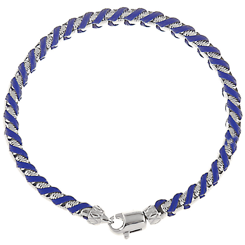 925 SS men's textured box bracelet woven with blue leather, Traversa lock & end caps, Rhodium Finish