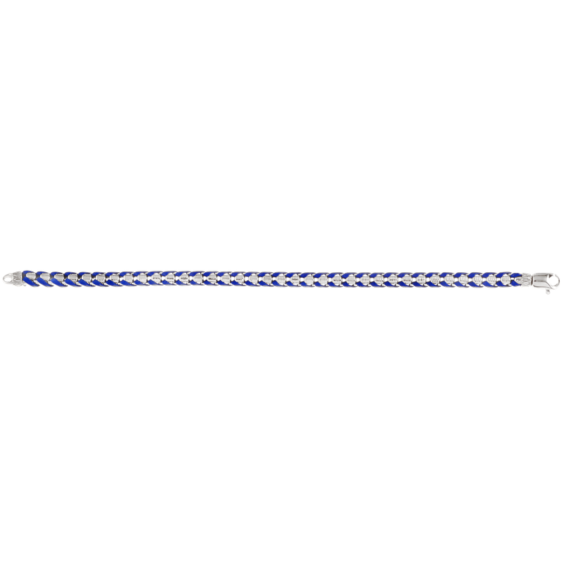 Alisa Men's textured box bracelet woven with blue leather, Traversa lock & end caps, Rhodium Finish