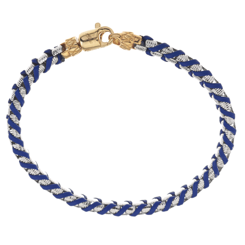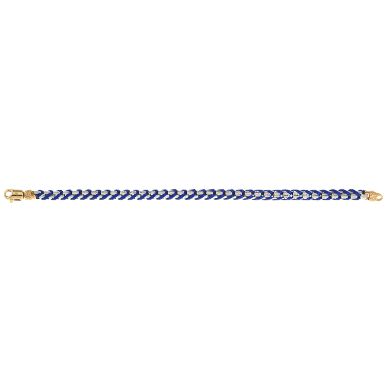 925 SS men's textured box bracelet woven with blue leather, 18K yellow gold lock & Traversa end caps, Rhodium Finish
