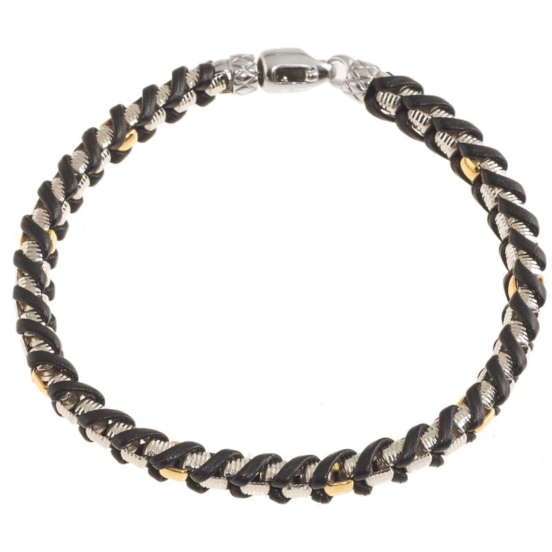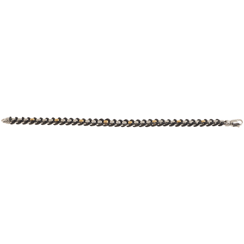 925 SS & 18K yellow gold men's textured box bracelet woven with black leather, Traversa lock & end caps, Rhodium Finish