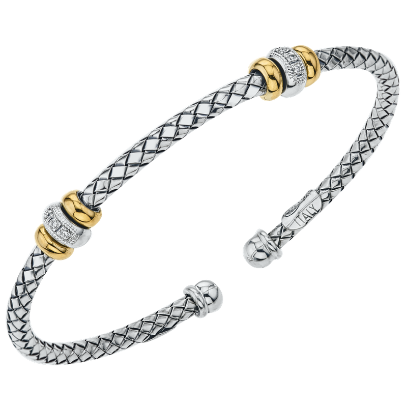 18K & 925 SS 3 MM Traversa cuff bangle bracelet, 2 gold rondelles, .06ct tw diamonds, Rhodium Finish