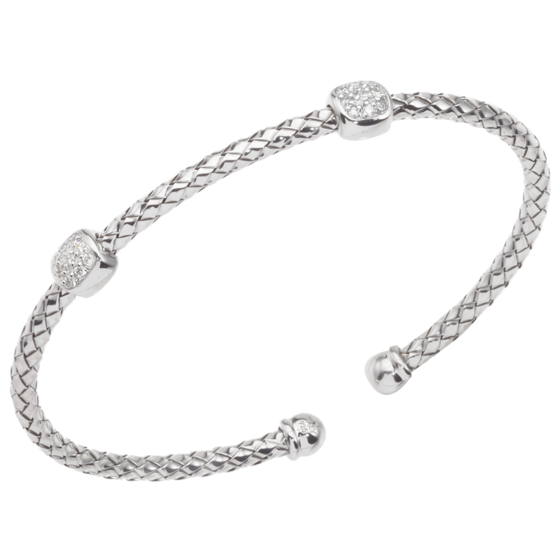 925 SS 3 MM Traversa cuff bangle bracelet, 2 cushion shapes, .28 ct tw diamonds, Rhodium Finish