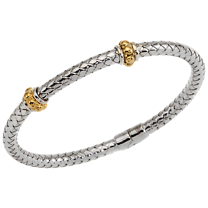 18K & 925 SS 4.75 MM Traversa spring cuff bangle bracelet, 2 beaded Yellow Gold rondelles, Rhodium Finish