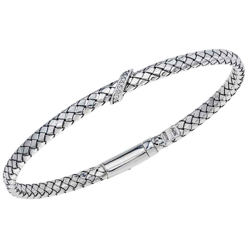 925 SS 5 MM flat Traversa locking bangle bracelet, 1 diagonal stripe, .045 ct tw diamonds, Rhodium Finish