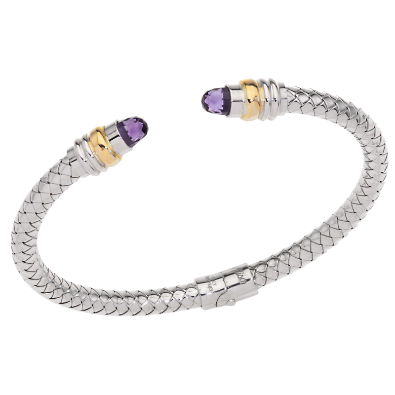 18K & 925 SS 4.75 MM Traversa spring cuff bangle bracelet, Yellow Gold rondelles, 2 Faceted Amethysts cabochons, Rhodium Finish
