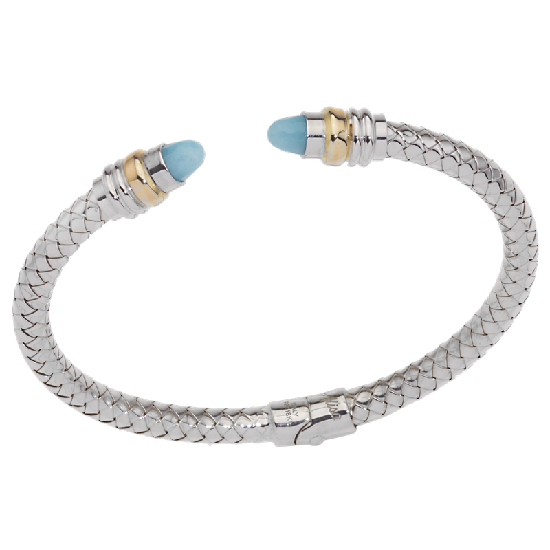 18K & 925 SS 4.75 MM Traversa spring cuff bangle bracelet, Yellow Gold rondelles, 2 Faceted Amazonite cabochons, Rhodium Finish
