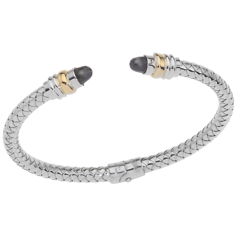 18K & 925 SS 4.75 MM Traversa spring cuff bangle bracelet, Yellow Gold rondelles, 2 Faceted Black Spinel cabochons, Rhodium Finish