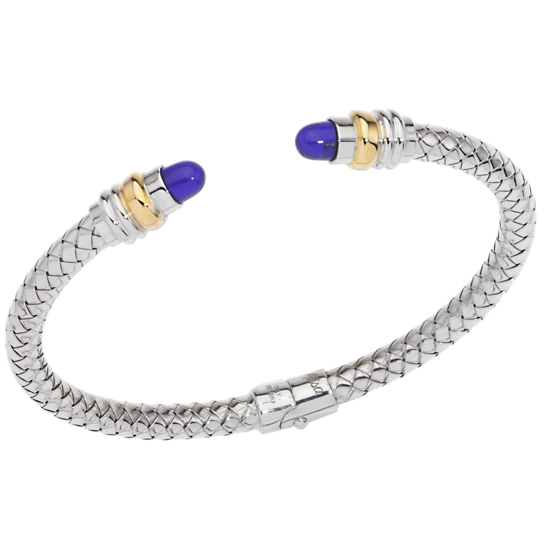 18K & 925 SS 4.75 MM Traversa spring cuff bangle bracelet, Yellow Gold rondelles, 2 Lapis Lazuli cabochons, Rhodium Finish