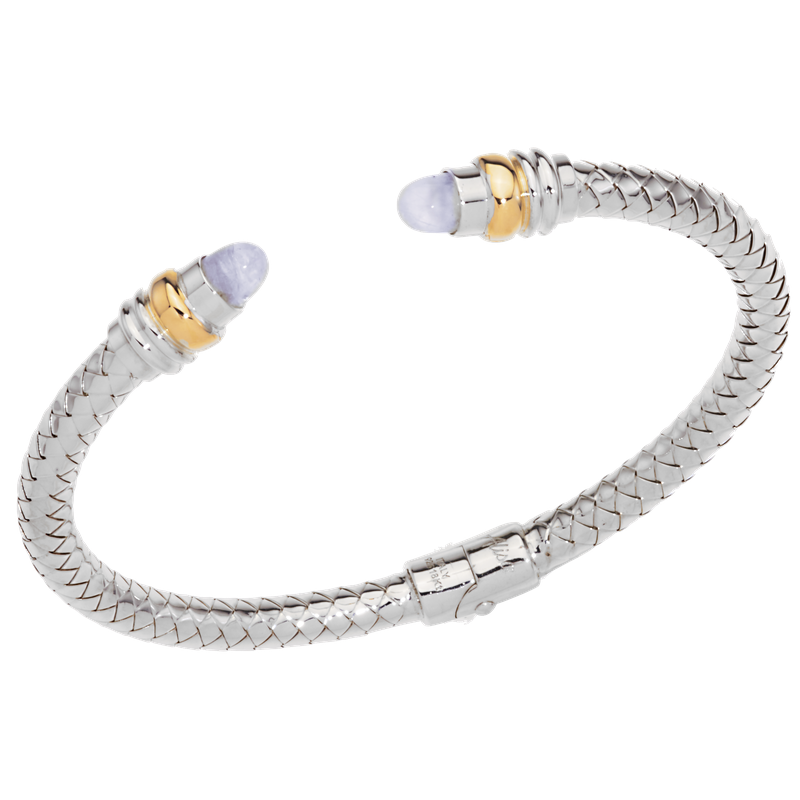 18K & 925 SS 4.75 MM Traversa spring cuff bangle bracelet, Yellow Gold rondelles, 2 Moonstone cabochons, Rhodium Finish