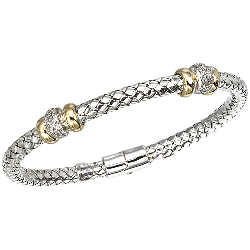 18K & 925 SS 5 MM Traversa spring cuff bangle bracelet, 2 stations, 4 Yellow Gold rondelles, .38 ct tw diamonds, Rhodium Finish