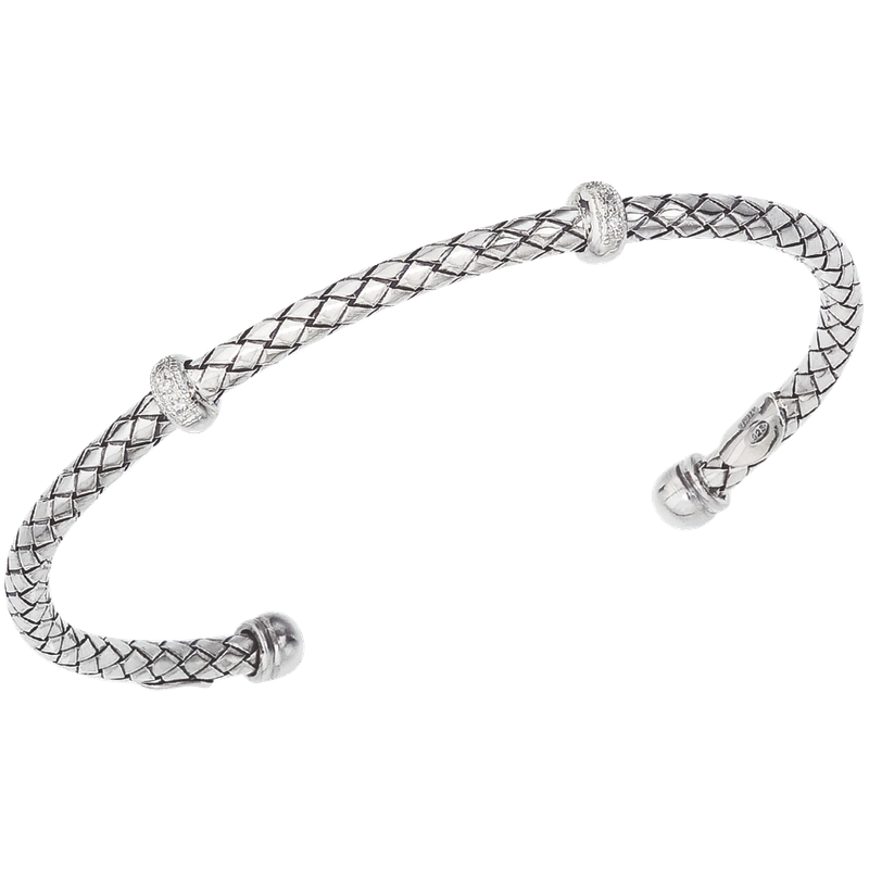 925 SS 3 MM Traversa cuff bangle bracelet, 2 rondelles, .06ct tw diamonds, Rhodium Finish