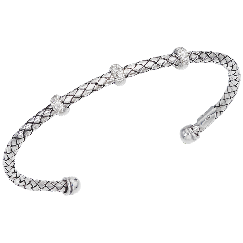 925 SS 3 MM Traversa cuff bangle bracelet, 3 rondelles, .09ct tw diamonds, Rhodium Finish