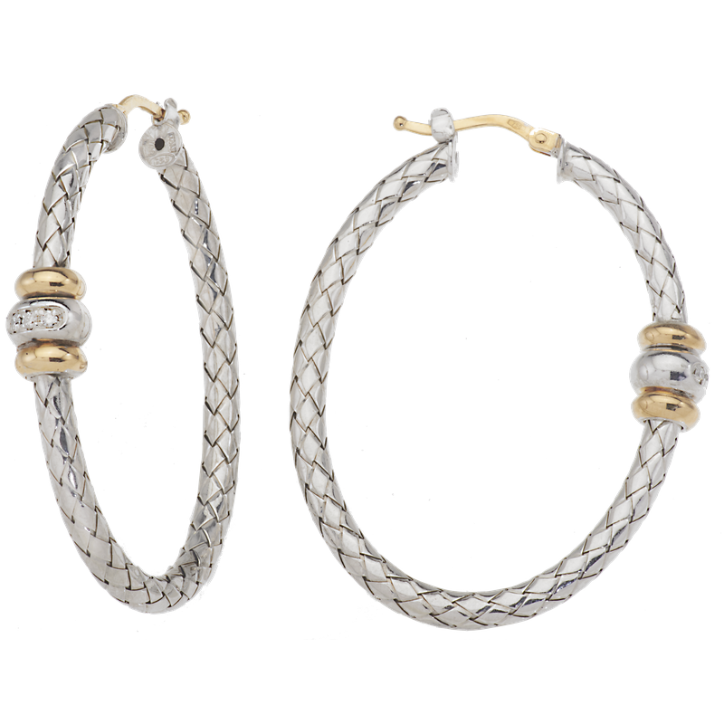 18K & 925 SS 45 X 35 MM oval Traversa hoop earrings, 2 Yellow Gold rondelles, .06ct tw diamonds, Rhodium Finish