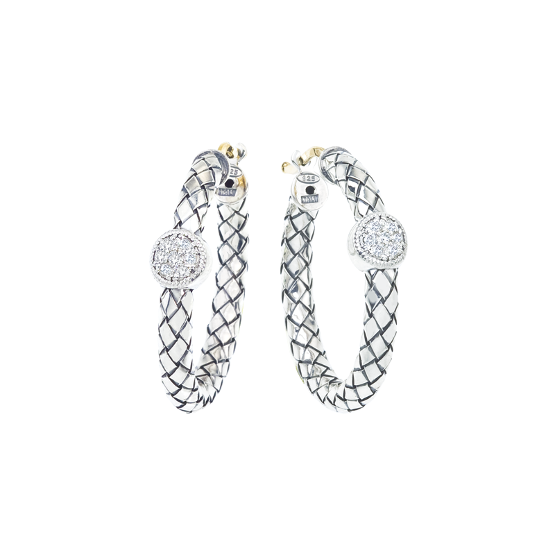 925 SS Traversa hoop earrings, round shape, 0.14 ct tw diamonds, 18K bar closing, Rhodium Finish