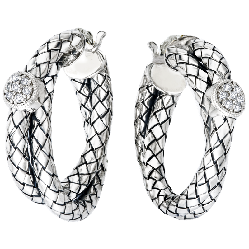 925 SS crossover round hoop earrings, round stations, .14 ct tw diamonds, Rhodium Finish