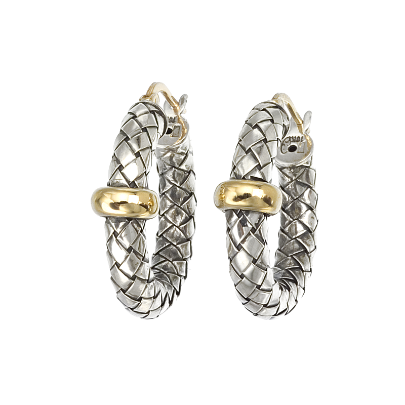 18K & 925 SS Traversa hoop earrings, 1 Yellow Gold rondelle, 18K bar closing, Rhodium Finish
