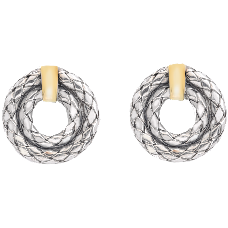 18K & 925 SS Traversa 16 MM round double loop earrings, 1 Yellow Gold rondelle, Rhodium Finish