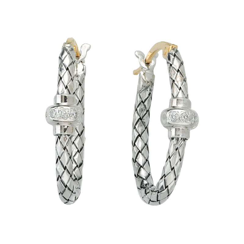 18K & 925 SS Traversa 24 X 14 MM hoop earrings, 1 rondelle, .06ct tw diamonds, Rhodium Finish