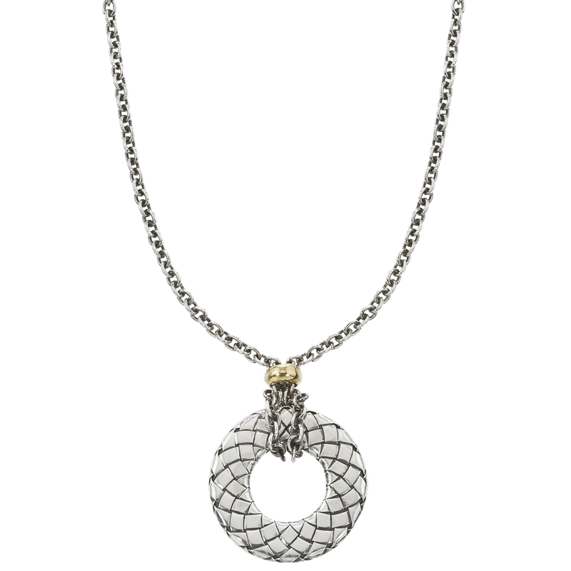 18K & 925 SS necklace, flat Traversa circle on chain, Yellow Gold rondelle, Rhodium Finish