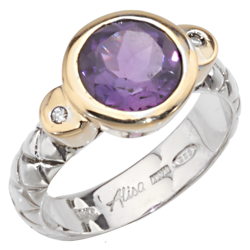 18K & 925 SS Traversa ring, round Faceted Amethyst, 0.03 ct tw diamonds, Rhodium Finish