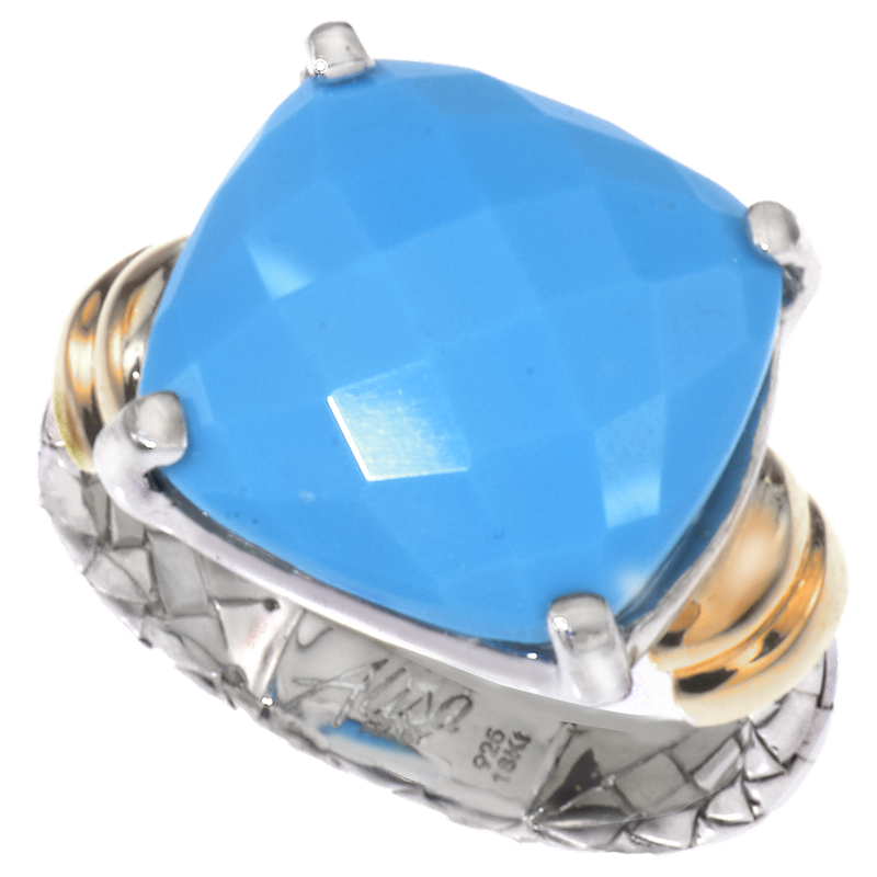 18K & 925 SS Traversa 4 prong ring, large Faceted Turquoise, Yellow Gold accents, Rhodium Finish