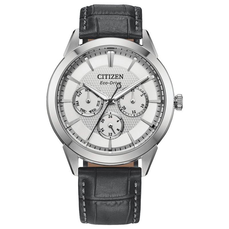 With vintage-inspired style that will never go out-of-date, this latest multi-function Rolan from Citizen takes the classic collection to the next level. The 40mm stainless steel case is the perfect base for the watch's matching silver-tone dial, with three sub-dials upon a textured inner sector adding to its unique appeal. Applied accents and a gray leather strap round out the look, with features including running and 24h time joining day and date indicators to balance the chic aesthetics with the functionality of this sophisticated timepiece. Sustainably powered by any light with our proprietary Eco-Drive technology and never needs a battery. Water resistant up to 100m. Caliber 8729.