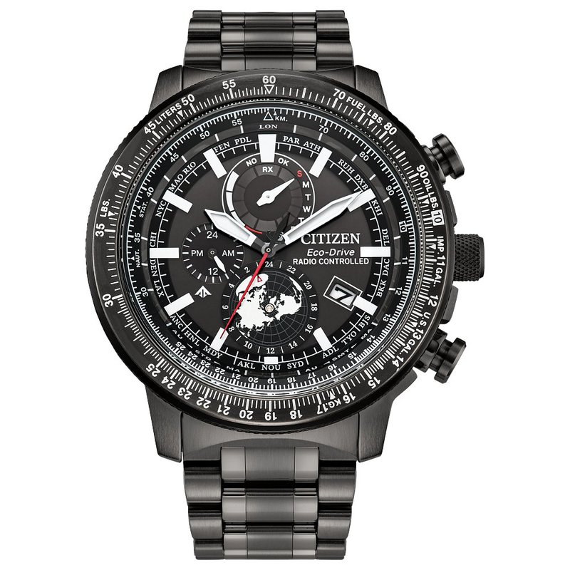 Touch the edge of the sky with the new Promaster. A bold 45mm stainless steel case in a dark gray tone centers the design, with the professional-grade pilot's watch mission-ready on the wrist– fully equipped with a bold set of chronograph pushers, 5-link stainless steel bracelet, and an outer slide rule bezel. Underneath a scratch-resistant sapphire crystal, the watch's data-driven display is on view, with white, red, and silver-tone accents working against a dark background for a rapid legibility for the wearer. Towards the 6 o'clock position, a namesake northern hemisphere disc rotates counter clockwise, with the detail showcasing the world time with a map inspired design. Other standard and advanced functions of the watch include running hours and minutes, date indication, power reserve indication, world time, and a slide rule bezel function. This distinctive sports watch utilizes Citizen's Eco-Drive technology that’s sustainably powered by any light and never needs a battery. Water resistant up to 200 meters. Caliber H864.