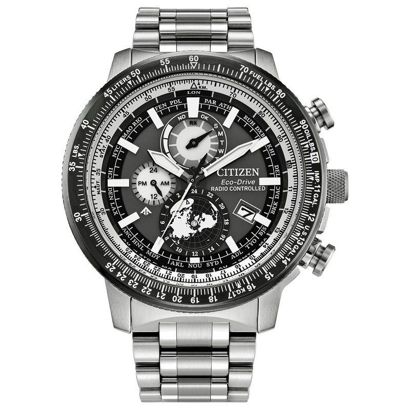 Touch the edge of the sky with the new Promaster. A bold 45mm stainless steel case in silver-tone centers the design, with the professional-grade pilot's watch mission-ready on the wrist – fully equipped with a bold set of chronograph pushers, 5-link stainless steel bracelet, and an outer slide rule bezel. Underneath a scratch-resistant sapphire crystal, the watch's data-driven display is on view, with white and silver-tone accents working against a dark background for a rapid legibility for the wearer. Towards the 6 o'clock position, a namesake northern hemisphere disc rotates counter clockwise, with the detail showcasing the world time with a map inspired design. Other standard and advanced functions of the watch include running hours and minutes, date indication, power reserve indication, world time, and a slide rule bezel function. This distinctive sports watch utilizes Citizen's Eco-Drive technology that’s sustainably powered by any light and never needs a battery. Water resistant up to 200 meters. Caliber H864.