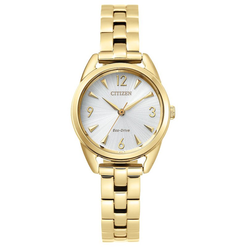 This Ladies’ Drive watch from Citizen is a “mini” version of the timeless classic. The graceful style features a gold-tone stainless-steel bracelet, a crisp white face with easy-to-read numerals and a gold-tone three-hand dial. It is the perfect choice for a daily-wear watch that will always work flawlessly, as it’s equipped with our patented Eco-Drive technology.