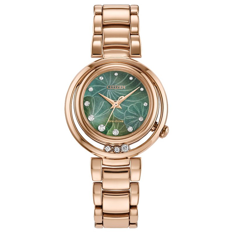 Classic lines and hints of romance make this newest piece to our women’s collection, the Citizen L Arcly, a captivating addition of sustainable luxury. With a design inspired by the original Citizen "Sunrise," the distinctive rose gold-tone stainless steel timepiece is a charming accent on the wrist that's perfect for glamorous wear. Sleek lines define the watch’s 29.8mm silhouette, with a subtle 4 o’clock crown and 7 o’clock diamond accent adding to its entrancingly delicate look. On its green-tinged mother-of-pearl dial, applied diamond markers and sharp hands indicate the time in style atop a subtle flower motif, keeping the attention on the pure aestheticism of the timepiece. Sustainably powered by any light with our proprietary Eco-Drive technology that never needs a battery, this elegant ladies’ watch is the perfect addition to elevate any outfit. Caliber E031.