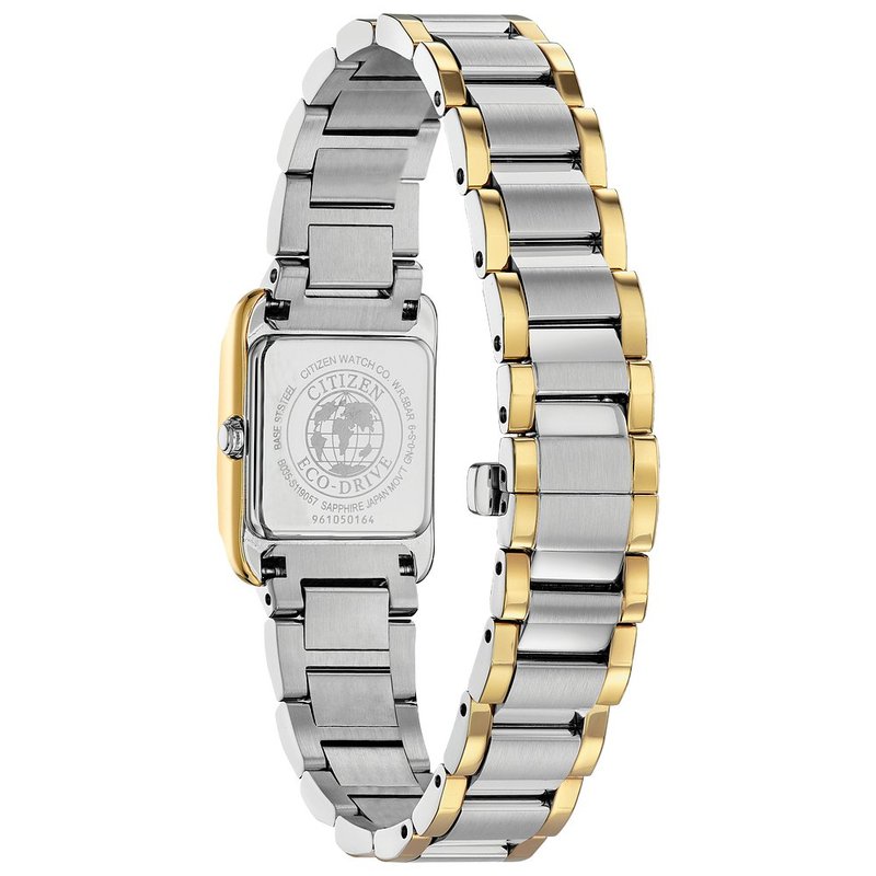 The CITIZEN L Collection represents the epitome of a ladies timepiece, showcasing all the sophistication, style and power that appeal to today's woman. The simplicity of the Citizen L case is partnered with an elegant light white Mother-of-Pearl dial with beveled sapphire crystal. Featured here in two-tone stainless steel. Featuring our Eco-Drive technology – powered by light, any light. Never needs a battery. Caliber number B035.