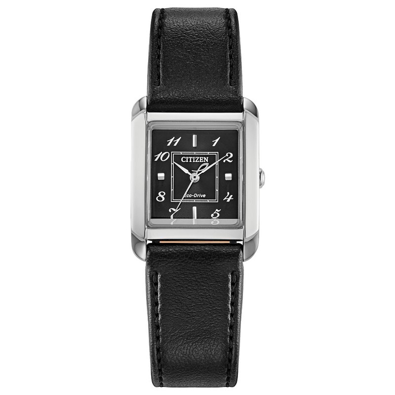 Classic lines and subtle sophistication make this latest piece to our womens’ collection, the Citizen L Bianca, a charming addition of sustainable luxury. With a design inspired and celebrating feminine motifs in art deco, the distinctive stainless-steel timepiece is a captivating accent on the wrist that's perfect for everyday wear. A curved rectangular shape defines the watch’s 22mm silhouette, with a subtle crown and black leather strap rounding out the look. On its deep black dial, alternating applied and printed markers work with a pair of silver-tone hands for a highly aesthetic style, with its printed inner square once again pointing to glamorous inspirations. Sustainably powered by any light with our proprietary Eco-Drive technology that never needs a battery, this elegant ladies’ watch is the perfect addition to any outfit. Water resistant to 50 meters. Caliber B035.