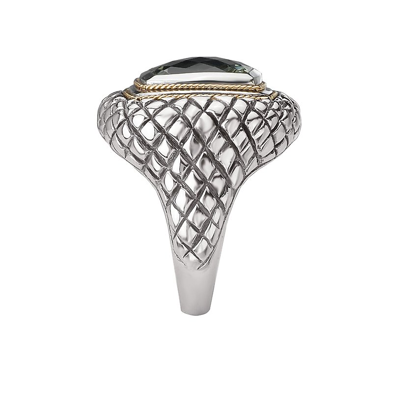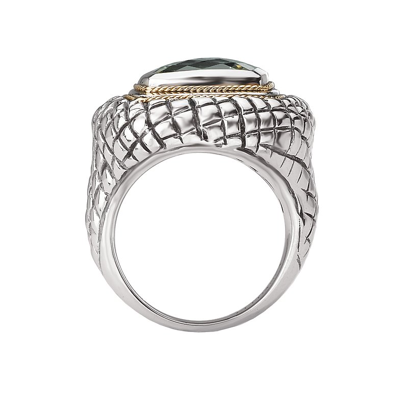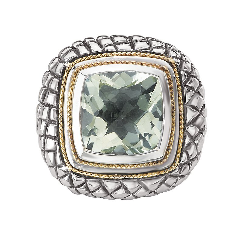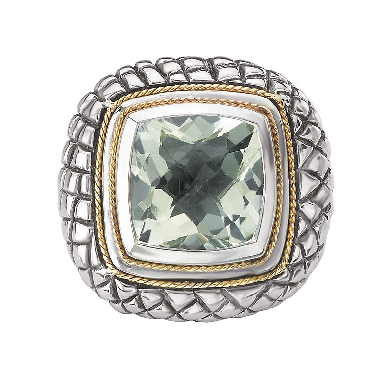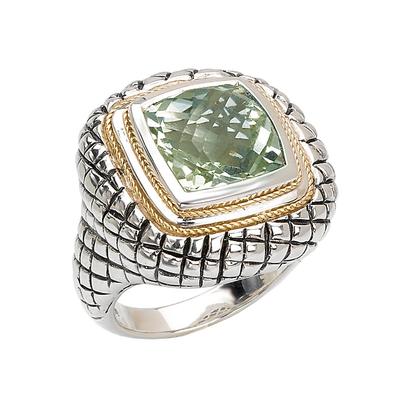 Faceted 11mm Green Amethyst Cushion Cut Ring in 18kt Yellow Gold and Sterling Silver.