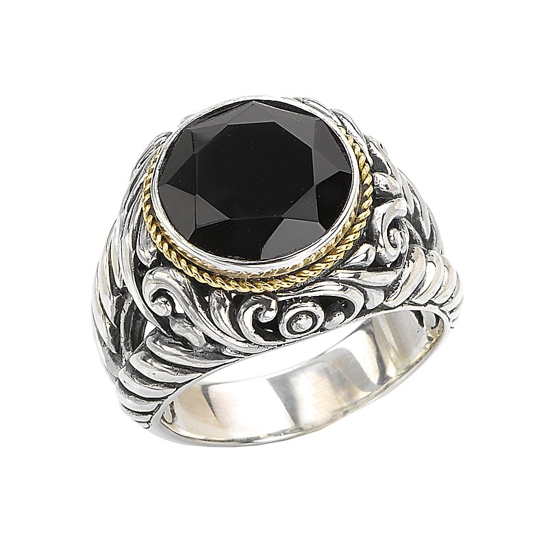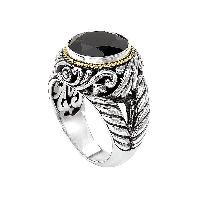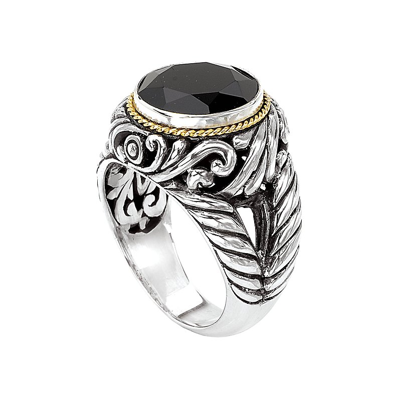 Faceted Black Onyx Sterling Silver Ring with Rope and Filigree Detail in 18kt Yellow Gold.