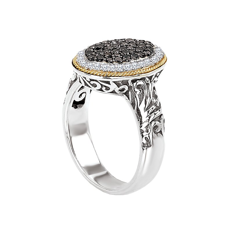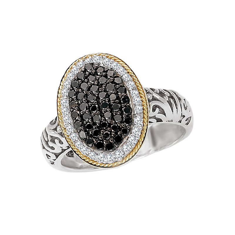 Black and White Diamond Oval Ring in 18kt Yellow Gold and Sterling Silver with Side Detail. (D 3/4 carat total weight; Wht D. 16 carat weight and Blk D. 53 carat weight)