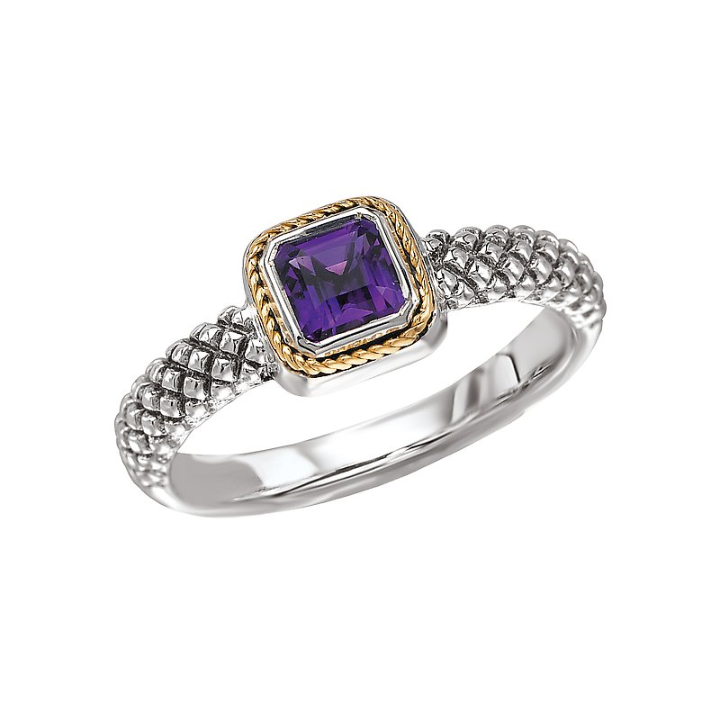 18kt Yellow Gold and Sterling Silver Ring with Cushion 5x5mm Amethyst Center. (AM .60 carat total weight).