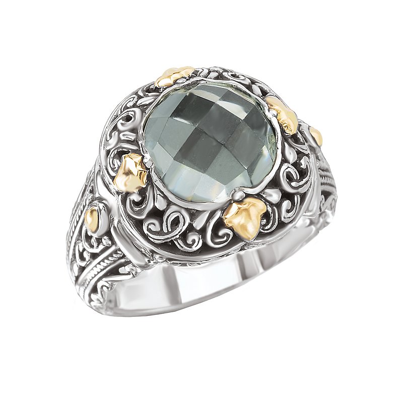 Oxidized Ornate Ring in Sterling Silver with Green Amethyst Round Center and 18kt Yellow Gold Accents.