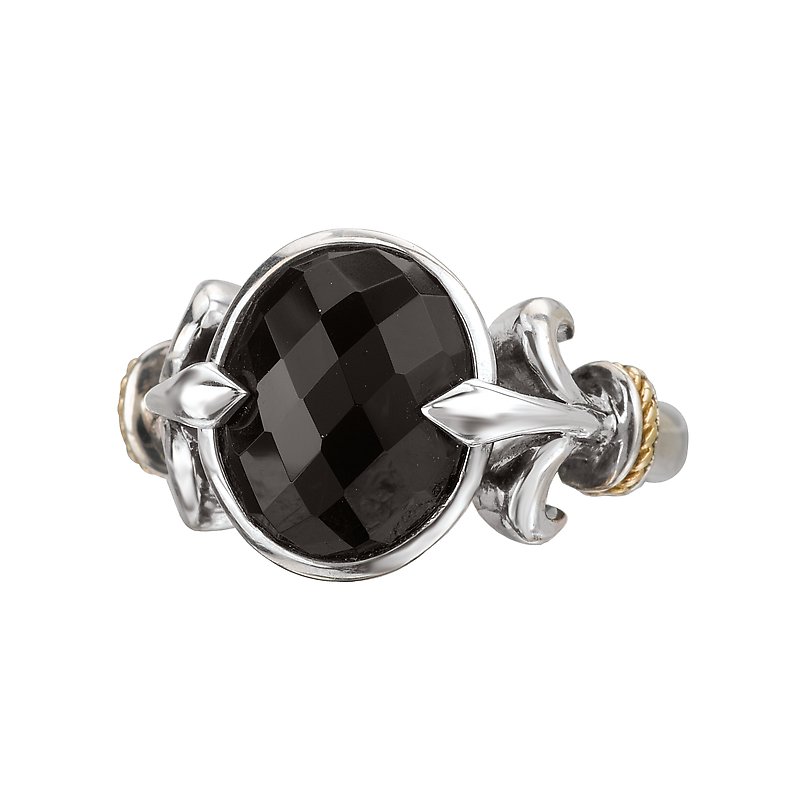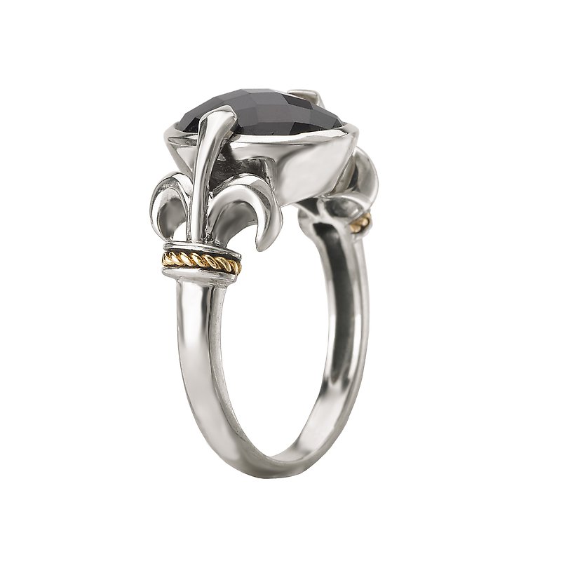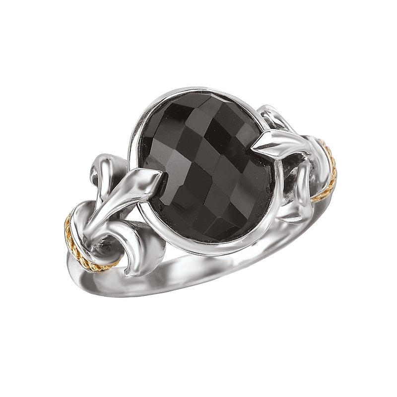 This is a Fleur-De-Lis Ring Crafted in Sterling Silver and 18k Yellow Gold with an Oval Black Onyx Center.