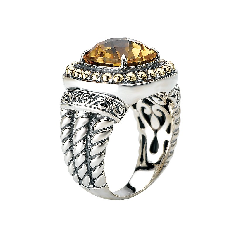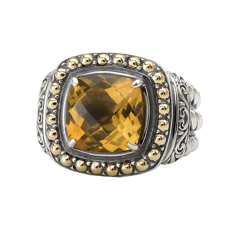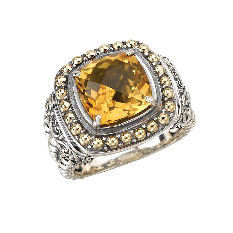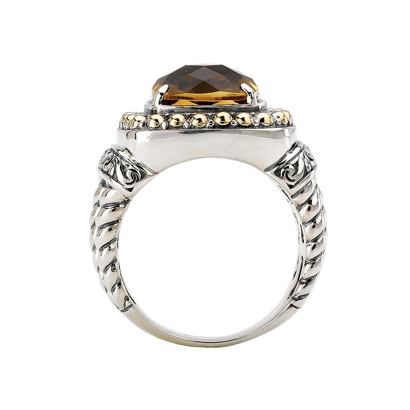 This 10mm faceted citrine center stone is surrounded by a beaded halo of 18k yellow gold. Twisting rope with an abundance of swirls are created in sterling silver to give this stylish ring pizazz.