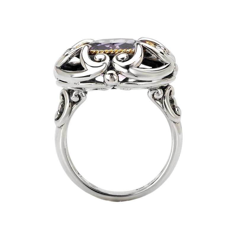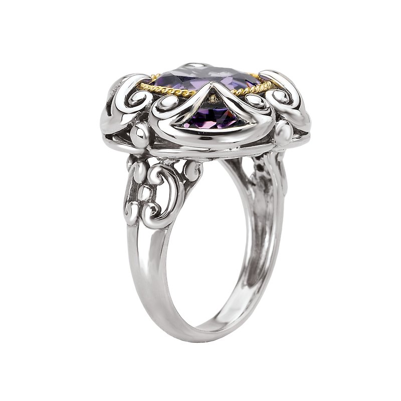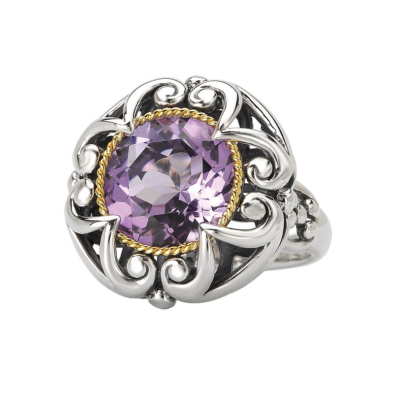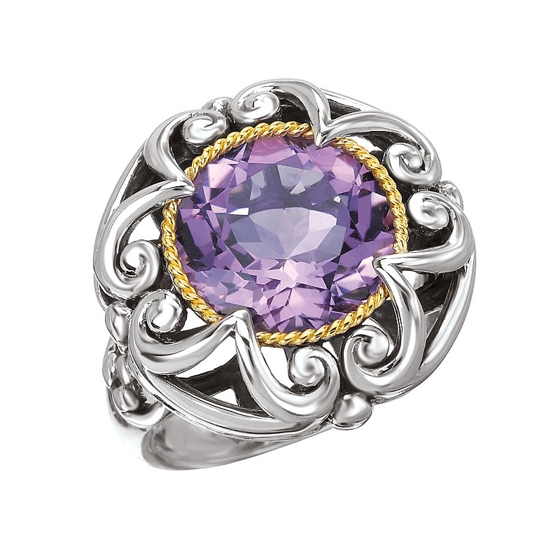 Sterling Silver Ring with a Round 12mm Amethyst Center Surrounded by 18kt Yellow Gold Rope Design.