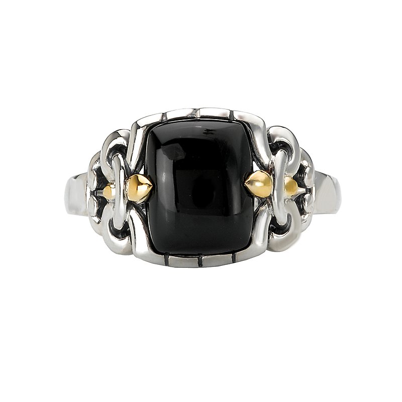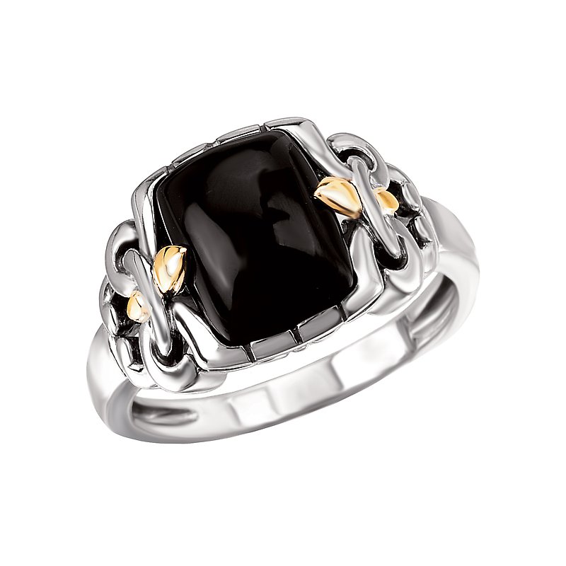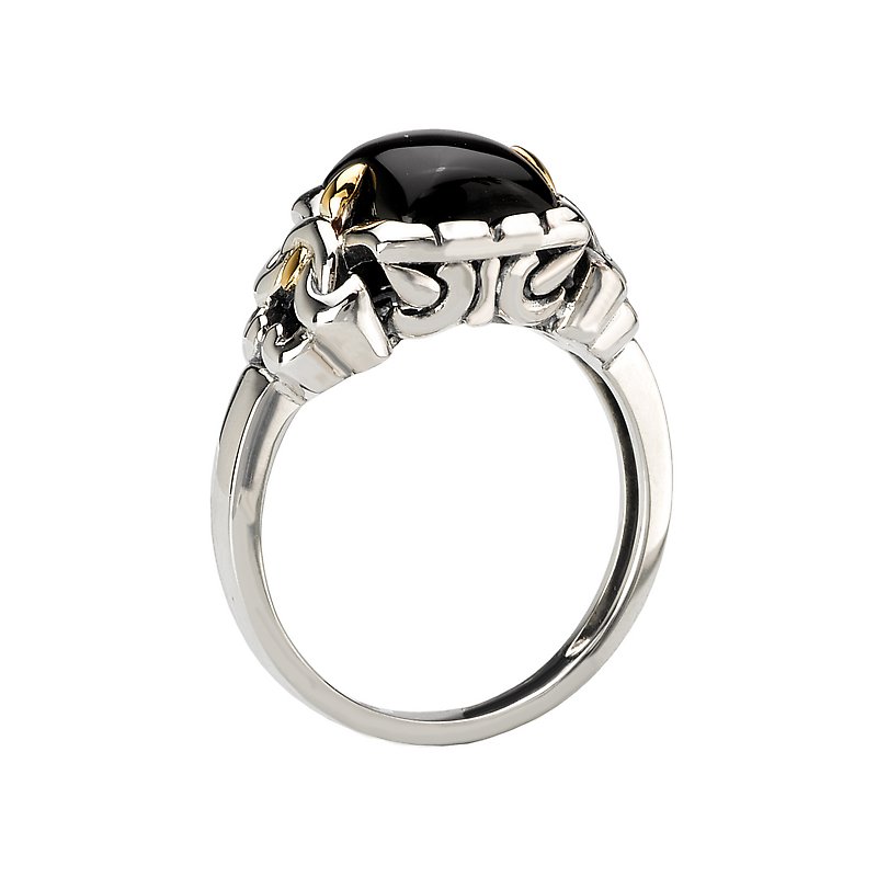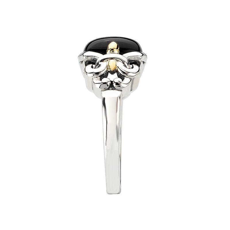 Sterling Silver and 18kt Yellow Gold Ring with a 10X8mm Black Onyx Cabochon Center and a Fleur-De-Lis Designs on the Side.