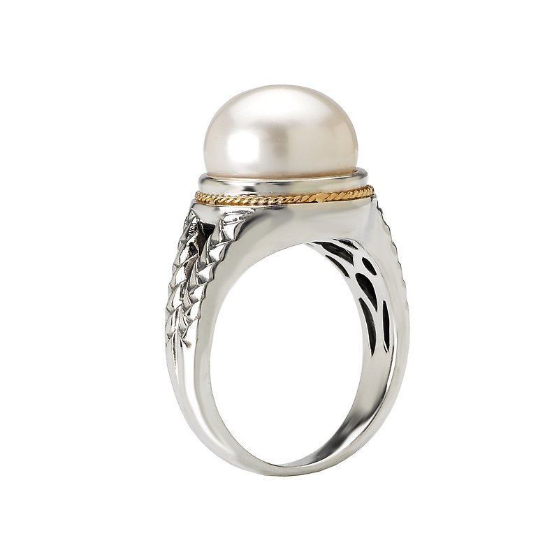12mm White Pearl Ring in Oxidized Sterling Silver with 18kt Yellow Gold Accents.