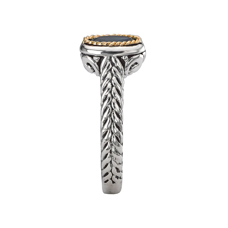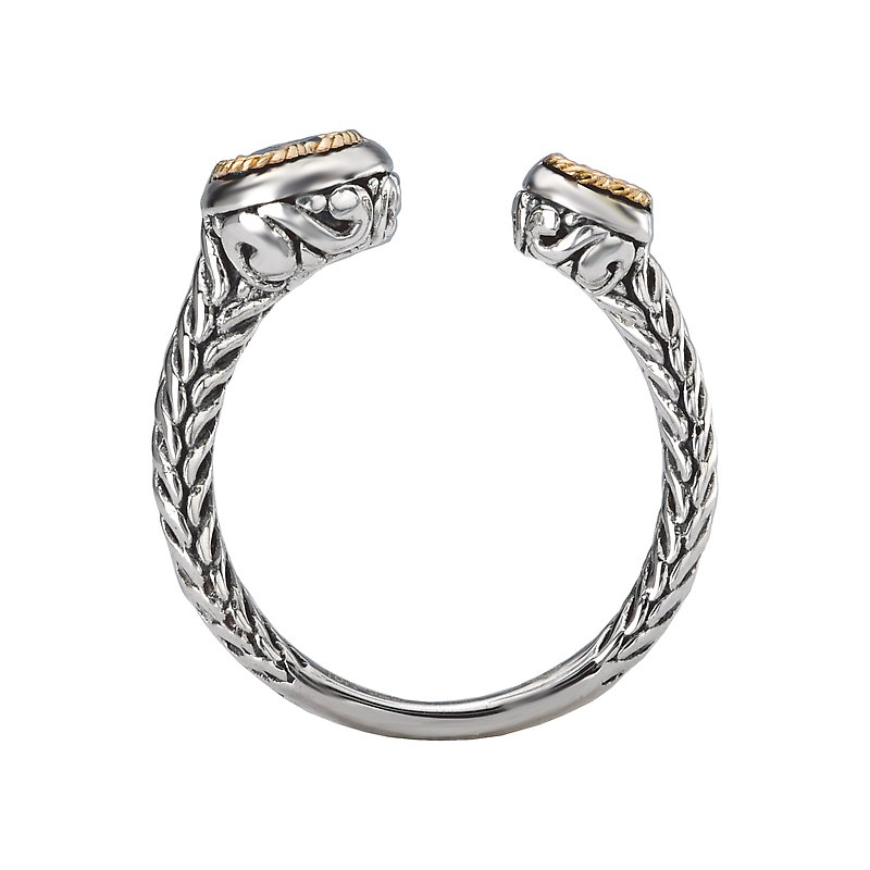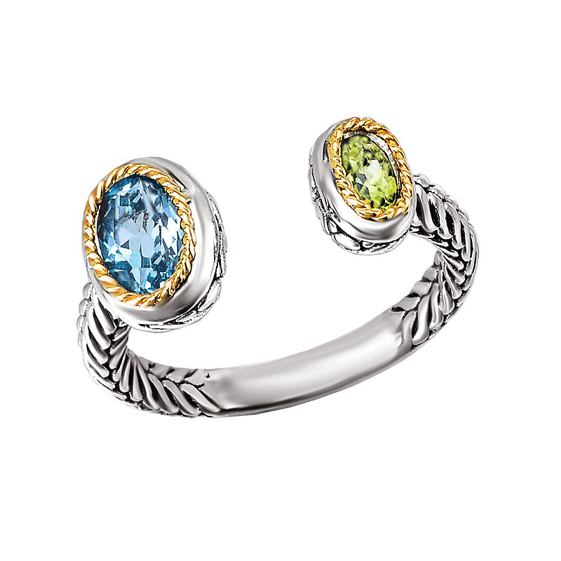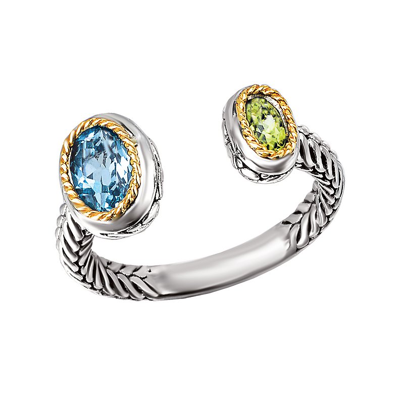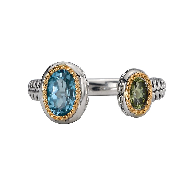 Halos of twisted 18k yellow gold surrounds these faceted oval gemstones displayed on the end caps of this open concept ring designed in sterling silver. (Blue topaz and Peridot)