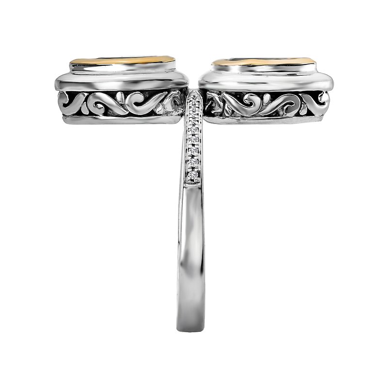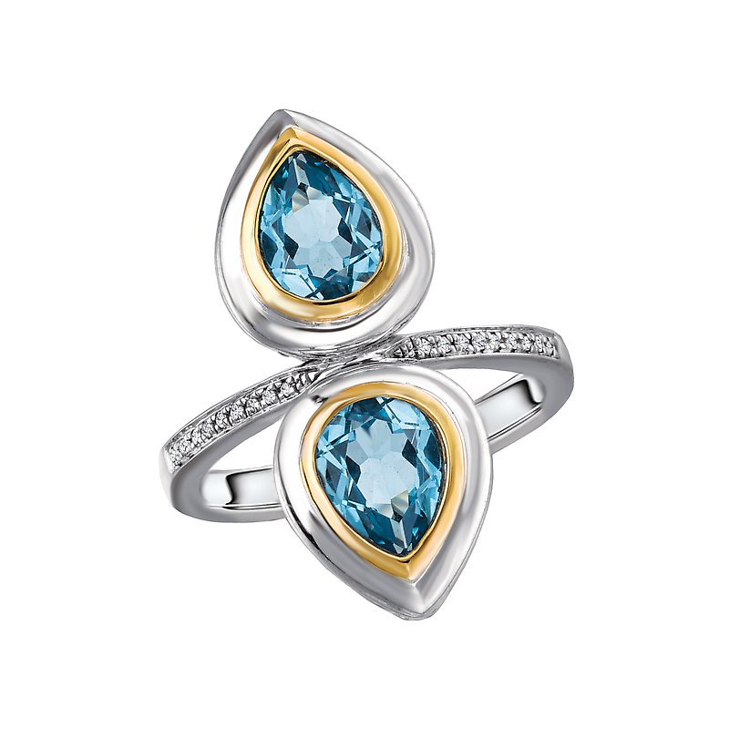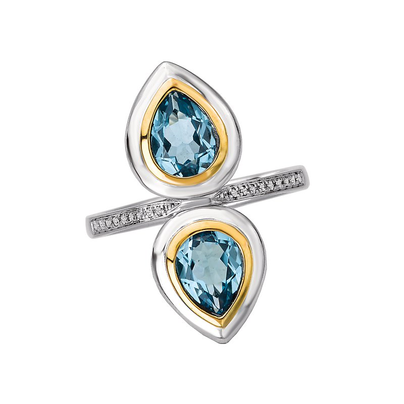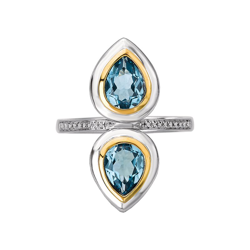 Unique fashion ring showcases two pear shaped 6x8mm blue topaz gemstones with diamonds set in high polished silver accented with 18k yellow gold. (D .029 carat weight)