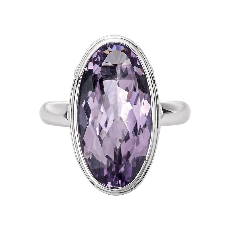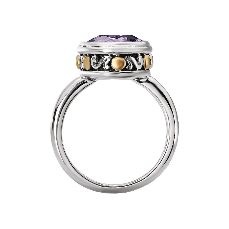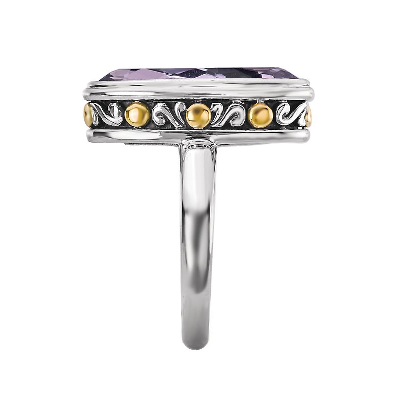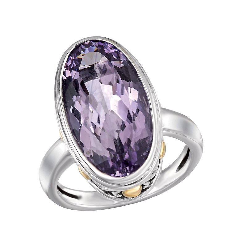 A faceted 20x10mm amethyst gemstone sits on top of this gorgeous fashion ring crafted in high polished silver with beaded accents in 18k yellow gold. Size 7
