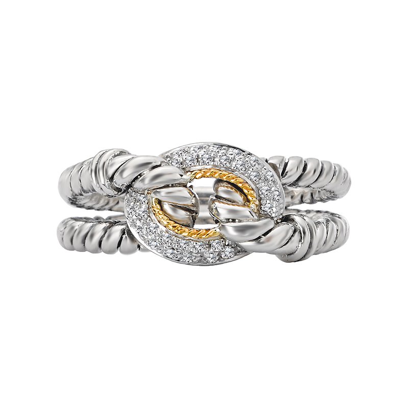 This lovely fashion ring features twisting bands of high polished silver wrapping around a knot lined with sparkling diamonds and accented in 18k yellow gold. (D 1/10 carat total weight)