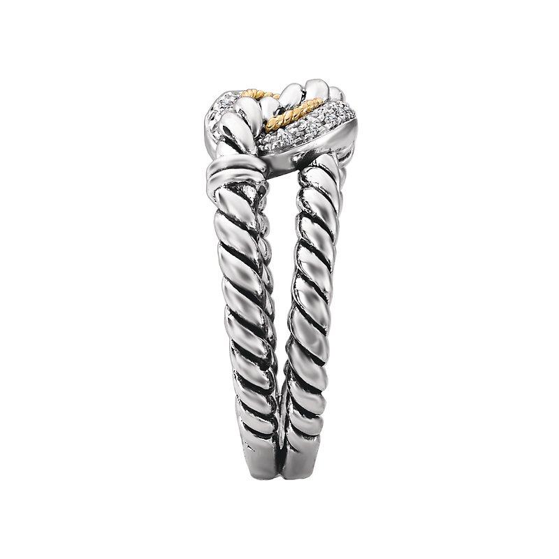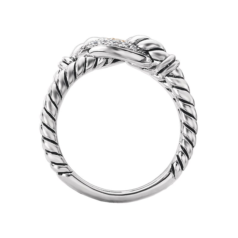 This lovely fashion ring features twisting bands of high polished silver wrapping around a knot lined with sparkling diamonds and accented in 18k yellow gold. (D 1/10 carat total weight)