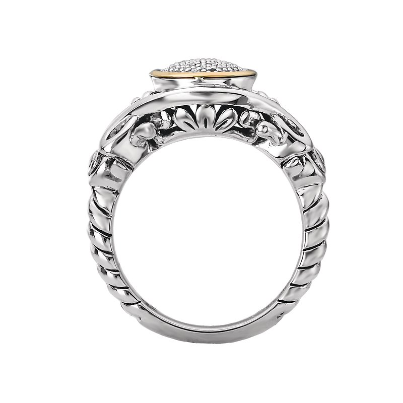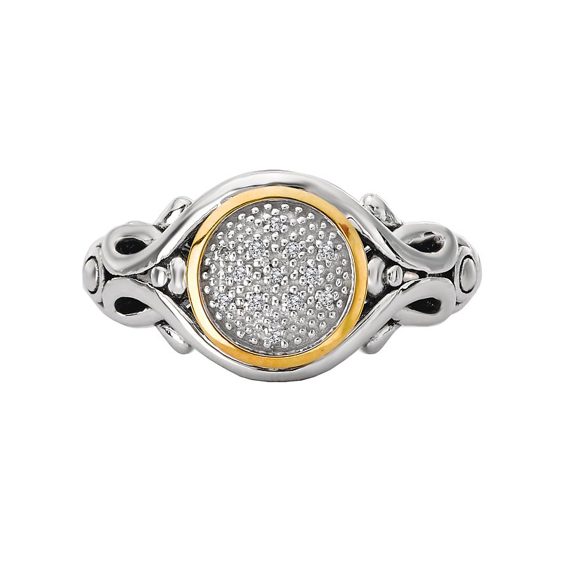 Eleganza ring showcases swirls of high polished silver surrounding the round 18k gold trimmed halo center filled with diamonds. (D .05 carat total weight)